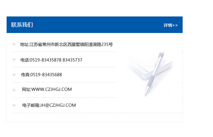 地址:常州市新北區友邦商務大廈1幢16、17層  電話:0519-85101652  傳真:0519-85112595  郵編:213022  網址:www_cz-jiayue_cn.kmdxkf120.com  郵箱:xiajifengaa@163.com